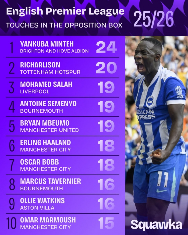 9月3日英超数据显示,Squawka公布了本赛季开始以来球员在对方禁区触球次数的排名,布莱顿的明特以24次位居榜首,热刺的理查利森以20次位列第二。